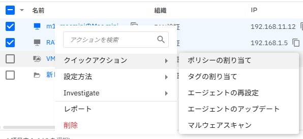 7. 自動でアップデートさせたくない端末を選択し、右クリックメニューの「クイックアクション」>「ポリシーの割り当て」をクリックします