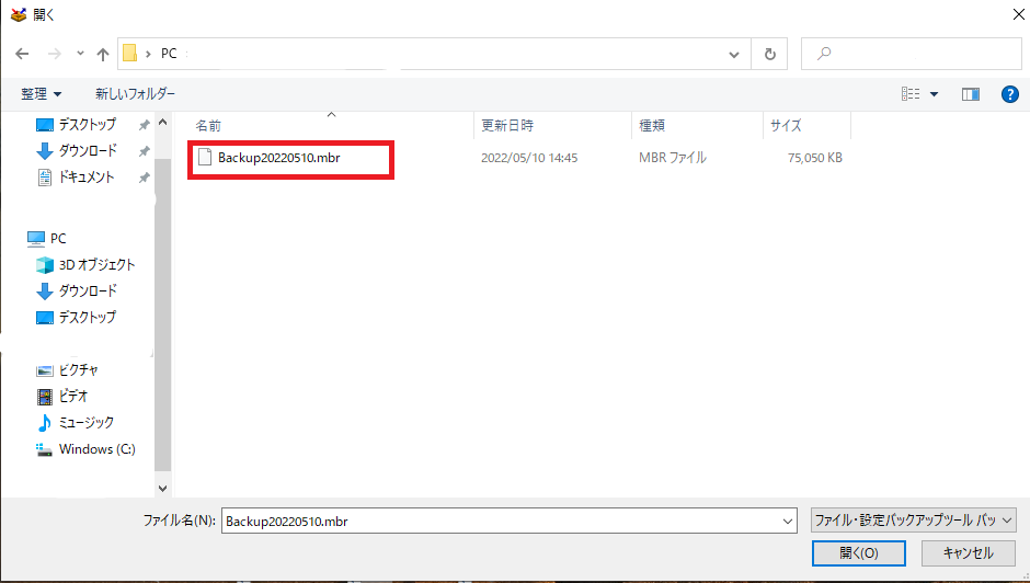 バックアップファイル([ファイル名.mbr])をクリックし(1)、[開く]ボタンをクリックします。(2)