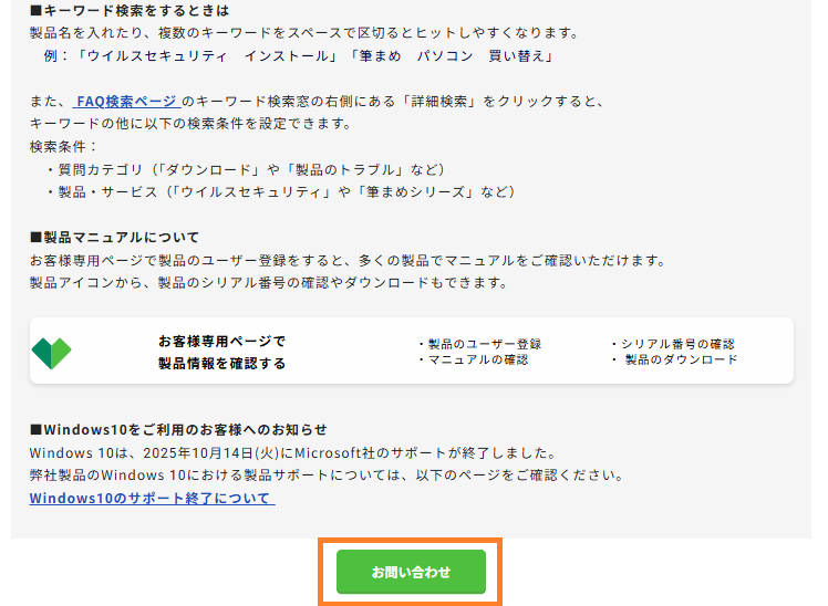 ・質問カテゴリ(「ダウンロード」や「製品のトラブル」など)