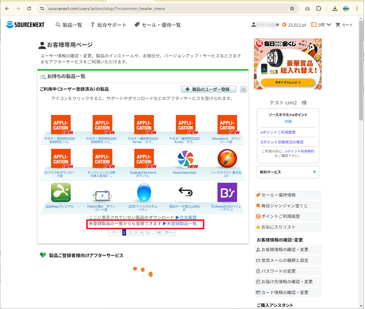 - 「お持ちの製品一覧」画面下の「未登録製品一覧」のリンクをクリックします