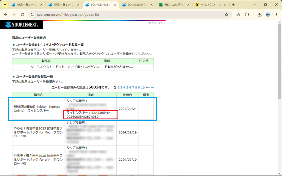 - 「駅前探検倶楽部」の項目の情報欄にライセンスキーが記載されています