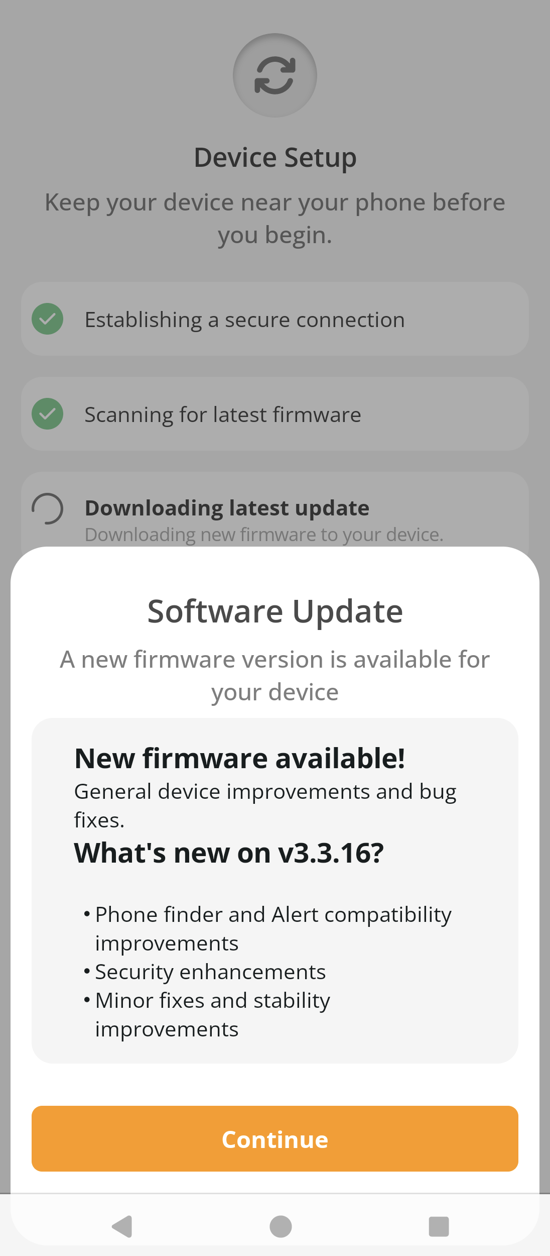 9.Pebblebee本体から「ピー」という音が鳴り、 アップデートの確認画面が表示されたら「Continue」をタップします。