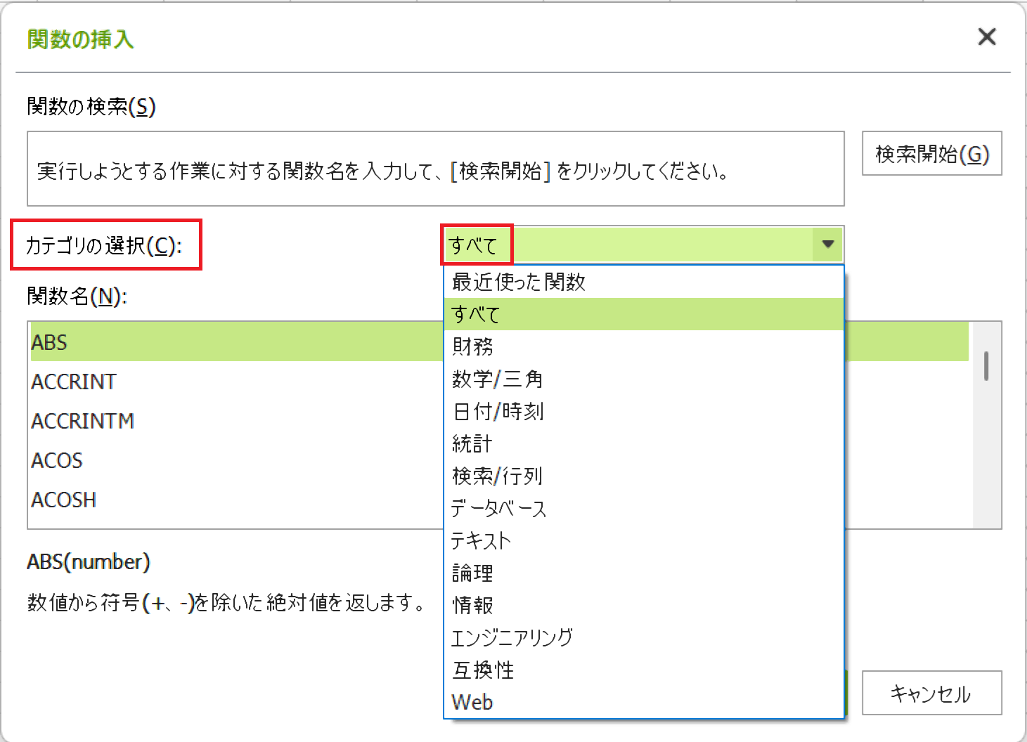 3、表示されたダイアログのカテゴリの選択で「すべて」を選択する。